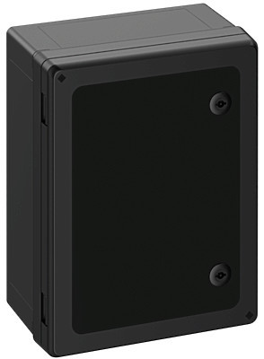 Schaltschrank, geeignet für die Installation in rauen Umgebungen und im ungeschützten Außenbereich, Kasten und Rahmen: glasfaserverstärktes Polycarbonat, schwarz, ähnlich RAL 9005, Tür: Polycarbonat.
