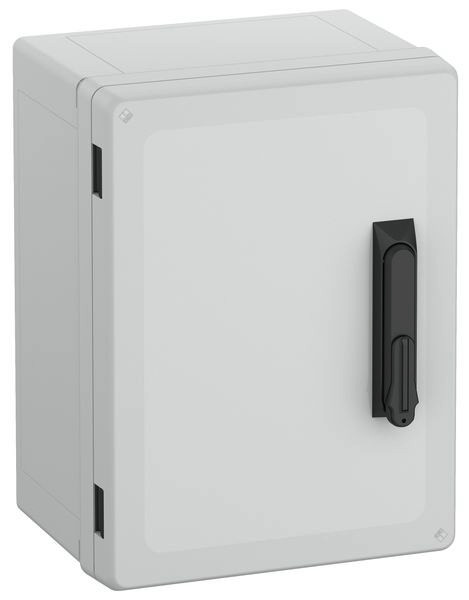Schaltschrank, geeignet für die Installation in rauen Umgebungen und im ungeschützten Außenbereich, Kasten und Rahmen: glasfaserverstärktes Polycarbonat, grau, ähnlich RAL 7035, Tür: Polycarbonat.