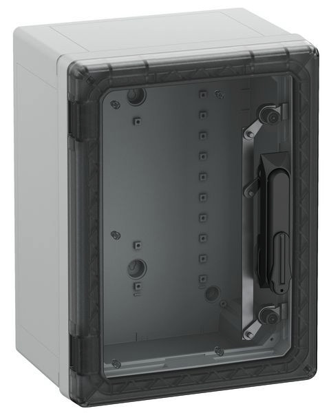 Schaltschrank, geeignet für die Installation in rauen Umgebungen und im ungeschützten Außenbereich, Kasten und Rahmen: glasfaserverstärktes Polycarbonat, grau, ähnlich RAL 7035, Tür: Polycarbonat.