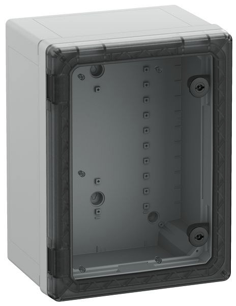 Schaltschrank, geeignet für die Installation in rauen Umgebungen und im ungeschützten Außenbereich, Kasten und Rahmen: glasfaserverstärktes Polycarbonat, grau, ähnlich RAL 7035, Tür: Polycarbonat.