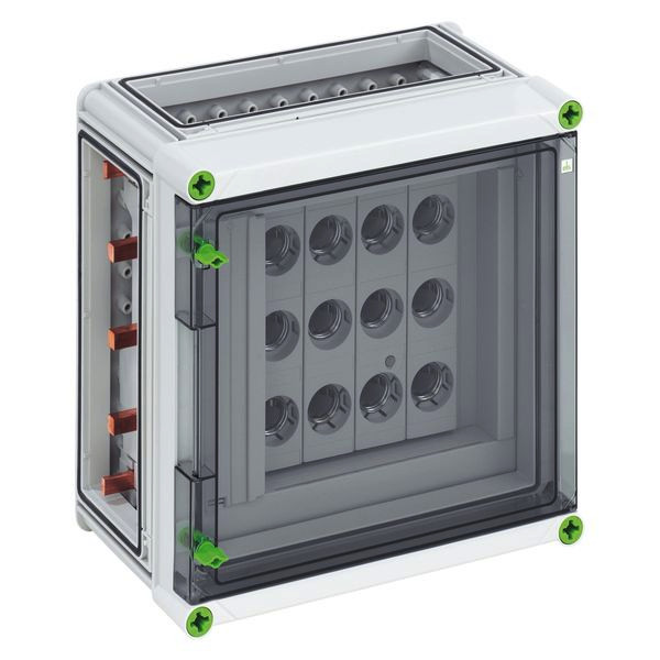 DIAZED(R)-Reiter-Sicherungsgehäuse, 4 x 3-polige DII-Reiter-Sicherungssockel, E 27-Gewinde, Bemessungsstrom 25 A, Schraubanschluss 1,5-25mm², auf Sammelschiene 5-polig, N-Klemmen 1,5-16mm², PE-Klemmen 1,5-16mm², 3 x Gehäuseverbinder (GGV), auf Sammelschienensystem 250 A, mit transparenter Klapptür