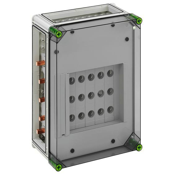 NEOZED(R)-Reiter-Sicherungsgehäuse mit zusätzlichem Anschlussraum, 5 x 3-polige D02-Reiter-Sicherungssockel, E 18-Gewinde, Bemessungsstrom 63 A, Schraubanschluss 1,5-25mm², auf Sammelschiene 5-polig, mit 5 Sammelschienenklemmen 16-70mm², N-Klemmen 1,5-16mm², PE-Klemmen 1,5-16mm², 3 x Gehäuseverbinder (GGV), auf Sammelschienensystem 250 A, mit transparentem Deckel