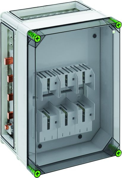 NH-Reiter-Sicherungsgehäuse mit zusätzlichem Anschlussraum, 1 x NH 2-Reiter-Sicherungsunterteil, Bemessungsstrom 400 A, Schraubanschluss M10, Abgang oben, auf Sammelschiene 5-polig, N-Klemme 16-120mm², PE-Klemme 16-120mm², 4 x Gehäuseverbinder (GGV), auf Sammelschienensystem 630 A, mit transparentem Deckel