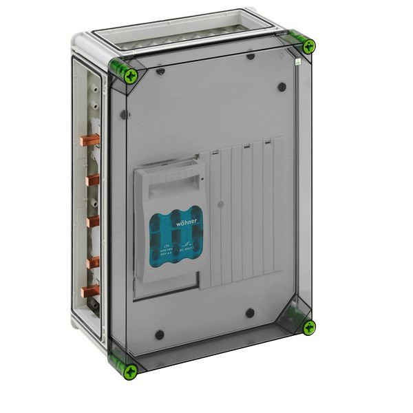 NH-Reiter-Sicherungs-Lasttrennschaltergehäuse mit zusätzlichem Anschlussraum, 1 x NH 00-Reiter-Sicherungs-Lasttrennschalter, Bemessungsstrom 125 A, Schellenanschluss 1,5-70mm², Abgang oben, auf Sammelschiene 5-polig, mit 5 Sammelschienenklemmen 16-70mm², N-Klemme 4-35mm², PE-Klemme 4-35mm², 3 x Gehäuseverbinder (GGV), auf Sammelschienensystem 250 A, mit transparentem Deckel