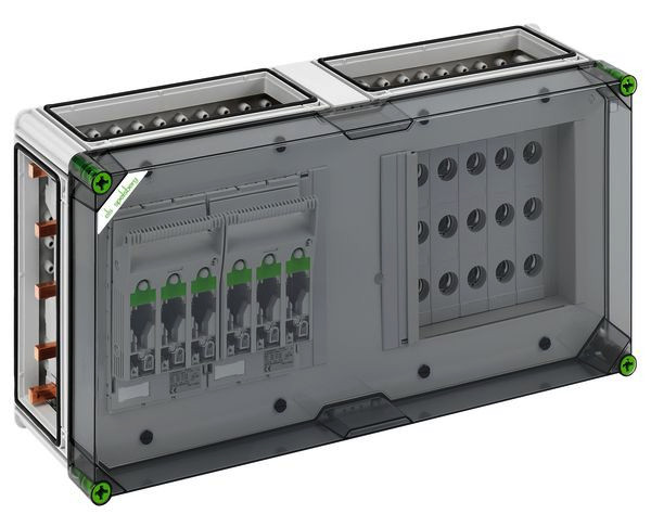 2 x NH 00, 5 x D02 Kombi-Reitergehäuse, 2 x NH 00-Reiter-Sicherungs-Lasttrennschalter, Schellenanschluss 1,5-50mm², Abgang universal, 5 x 3-polige D02-Reiter-Sicherungssockel, E 18-Gewinde, Schraubanschluss 1,5-25mm², auf Sammelschiene 5-polig, mit 5 Sammelschienenklemmen zum direkten Anschluss eines Kabels an das Sammelschienensystem, zusätzliche N- und PE-Klemme für jeden Trennschalter, 4 x Gehäuseverbinder (GGV), Sammelschienensystem 400 A, mit transparentem Deckel