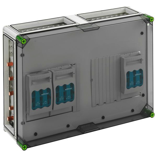 NH-Reiter-Sicherungs-Lasttrennschaltergehäuse mit zusätzlichem Anschlussraum, 3 x NH 00-Reiter-Sicherungs-Lasttrennschalter, Bemessungsstrom 125 A, Schellenanschluss 1,5-70mm², Abgang oben, auf Sammelschiene 5-polig, mit 5 Sammelschienenklemmen 16-70mm², N-Klemmen 4-35mm², PE-Klemmen 4-35mm², 4 x Gehäuseverbinder (GGV), auf Sammelschienensystem 630 A, mit transparentem Deckel