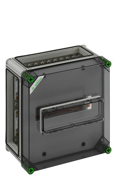Sammelschienengehäuse, 5-polig, 40mm Sammelschienenabstand, mit CU-Schienen, L1...L3: 12 x 5mm, PE/N: 12 x 5mm, mit 10 Klemmen für CU-Leiter 4-35mm², mit Berührungsschutzabdeckung, mit Klappfenster 12 TE, plombierbar, 1x Abdeckstreifen 12TE verriegelbar, 3 x Gehäuseverbinder (GGV), mit transparentem Deckel, zur individuellen Bestückung
