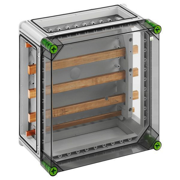 Sammelschienengehäuse, 5-polig, 400 A, L1...L3: 20 x 10mm, mit CU-Schienen, N: 20 x 10mm, PE: 12 x 10mm, ohne Klemmen, zur individuellen Bestückung, 3 x Gehäuseverbinder (GGV), mit transparentem Deckel