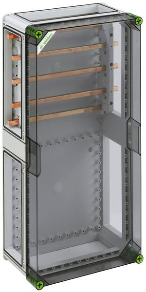 Industrie Qualität, 5-polig, 250 A, mit Cu-Schienen, L1...L3: 12 x 10 mm, N: 12 x 10 mm, PE: 12 x 10 mm, ohne Klemmen, zur individuellen Bestückung, Schlagfestigkeit IK08, Schutzklasse II, Bemessungsisolationsspannung Ui 690VAC, halogenfrei