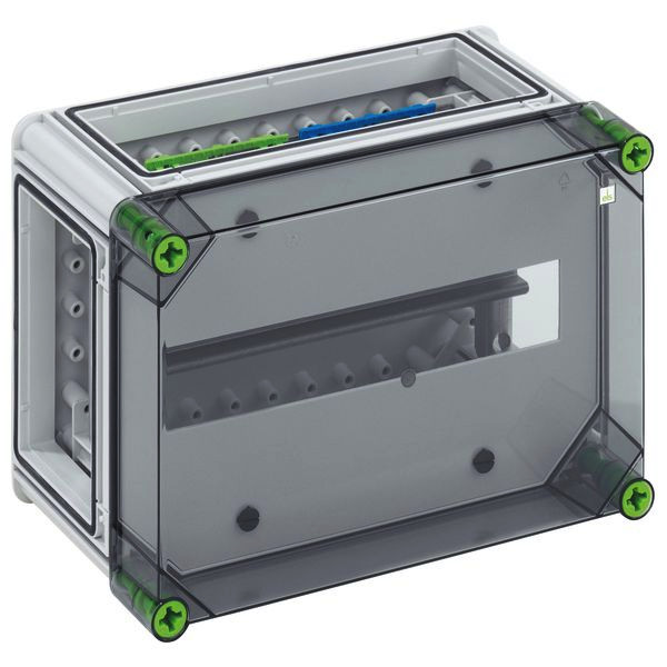 Automatengehäuse, 1-reihig, PE/N-Klemme, mit jeweils 2 Klemmstellen 16mm², 10 Klemmstellen 6mm², Abdeck- und Beschriftungsstreifen, 3 x Gehäuseverbinder (GGV), mit transparentem Deckel