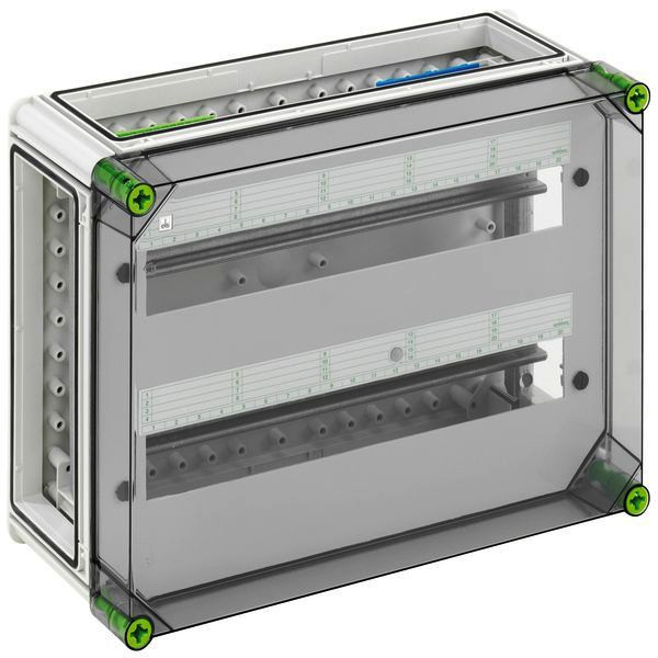 Automatengehäuse, 2-reihig, PE/N Klemme, mit jeweils 2 Klemmstellen 16mm², 10 Klemmstellen 6mm², Abdeck- und Beschriftungsstreifen, 3 x Gehäuseverbinder (GGV), mit transparentem Deckel