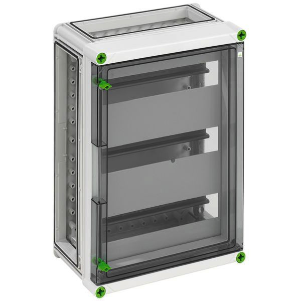 Automatengehäuse, 3-reihig, PE/N Klemme, mit jeweils 2 Klemmstellen 16mm², 10 Klemmstellen 6mm², Abdeck- und Beschriftungsstreifen, 3 x Gehäuseverbinder (GGV), mit transparenter Klapptür