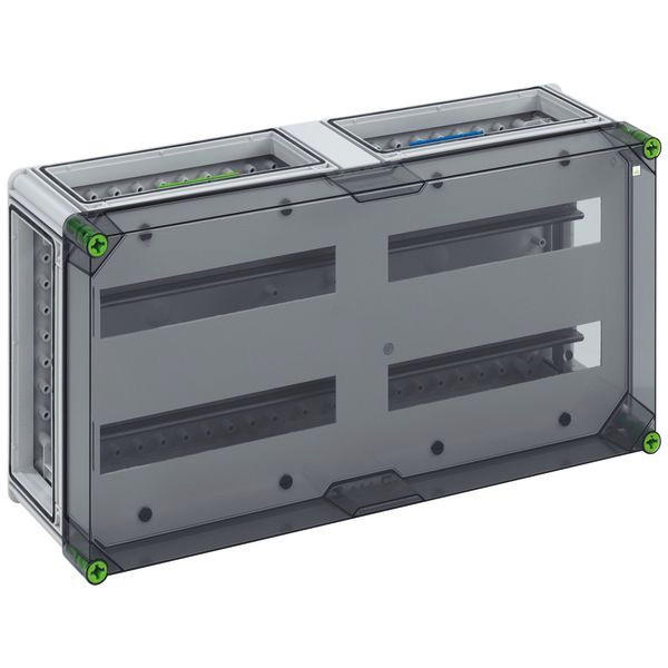 Automatengehäuse, 4-reihig, PE/N Klemme, mit jeweils 2 Klemmstellen 16mm², 10 Klemmstellen 6mm², Abdeck- und Beschriftungsstreifen, 4 x Gehäuseverbinder (GGV), mit transparentem Deckel