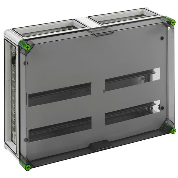 Automatengehäuse mit zusätzlichem Anschlussraum, 56 Teilungseinheiten, 4-reihig, Ohne PE/N-Klemmen, Abdeck- und Beschriftungsstreifen, 4 x Gehäuseverbinder (GGV), mit transparentem Deckel