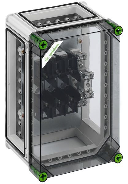 NH-Sicherungsgehäuse, 1 x NH 00-Sicherungsunterteil, Schellenanschluss 1,5-70mm², PE/N-Klemme 2 x 50mm², montiert auf Montageplatte, 3 x Gehäuseverbinder (GGV), mit transparentem Deckel