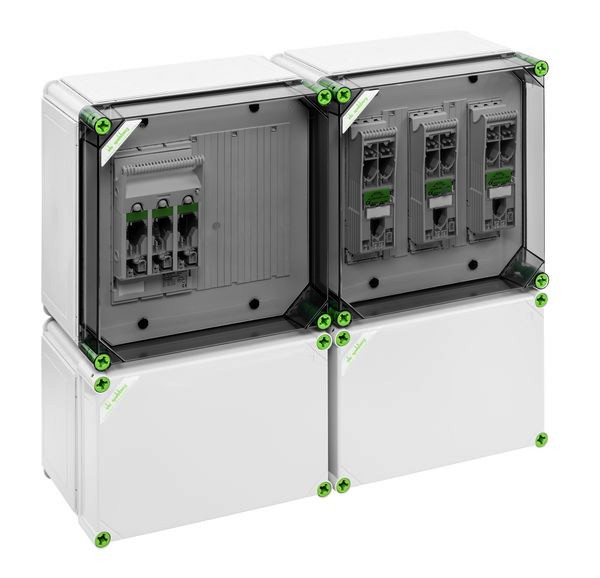 , bestehend aus: NH00-Reiter-Sicherungs-Lasttrennschaltergehäuse GST 2015-250, NH000-Reiter-Sicherungs-Lasttrennschaltergehäuse GST 2335-250, Flanschen mit metrischen Vorprägungen, zum Anschluss von 3 Wechselrichtern (3-phasig) bis max. 70 kVA Gesamtleistung