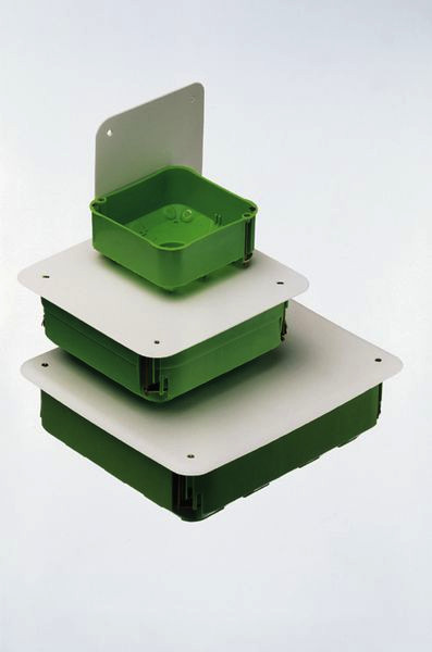 Hohlwand-Abzweigkästen, flammwidrig, für Plattenstärken 7-35mm, inklusive weißem Verschlussdeckel, 107 x 107 x 53mm, mit Bohrschablone für 35mm Bohrlöcher