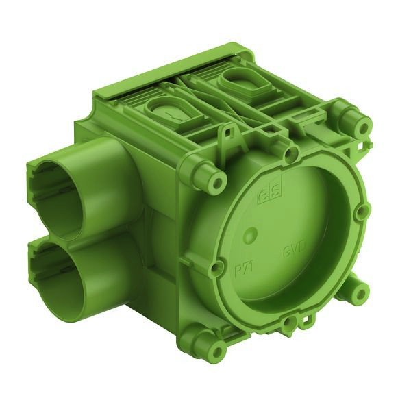 Geräteverbindungsdose für die liegende Werksfertigung, 1-teilig, Durchmesser 60mm Ø, mit vergrößertem Anschlussraum, 4 Schraubdome mit Schraubabstand 60mm, kombinierbar, mit Krallenbefestigung, kombinierbar im Normabstand 71mm, geeignet auch für Gegenschalung, VDE zertifiziert nach DIN EN 60670 (VDE 0606), für Haftmagnet 50mm HM-UNI (97929901), Magnetbefestigung, Integrierte Rohradapter und zusätzliche Rohradapter mit Easy-Cut-Membran, Dichtbereich M16-M25, stützholmfähig