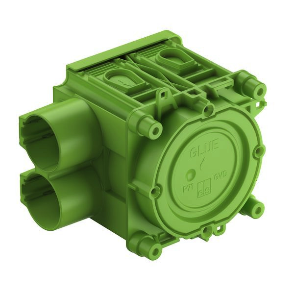 Geräteverbindungsdose für die liegende Werksfertigung, 1-teilig, Durchmesser 60mm Ø, mit vergrößertem Anschlussraum, 4 Schraubdome mit Schraubabstand 60mm, kombinierbar, mit Krallenbefestigung, kombinierbar im Normabstand 71mm, geeignet auch für Gegenschalung, VDE zertifiziert nach DIN EN 60670 (VDE 0606), Klebebefestigung, Integrierte Rohradapter und zusätzliche Rohradapter mit Easy-Cut-Membran, Dichtbereich M16-M25, stützholmfähig