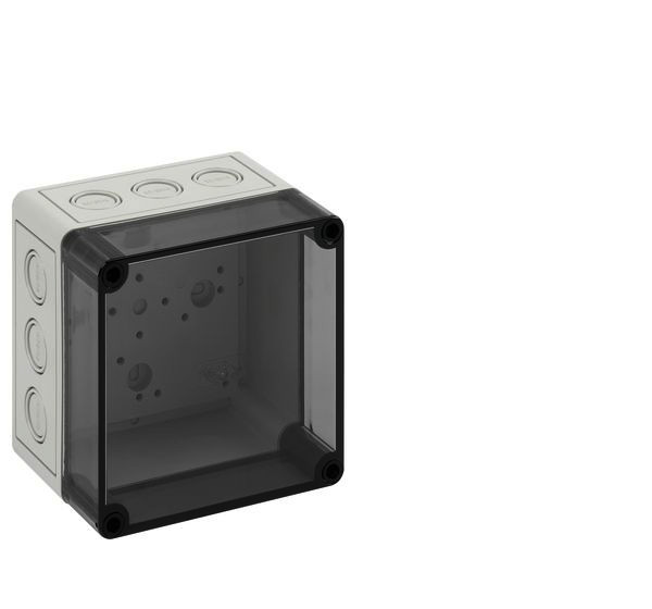 m = metrisch, o = ohne Vorprägung, tv = mit angespritzter Kabelverschraubung Leergehäuse, mit Schutzart IP66, Polycarbonat, glasfaserverstärkt, zertifiziert durch UL (UL 508 & CSA C22.2 No. 14-13, UL 50 & CSA 22.2 No. 94.1-7 & UL 50E & CSA C22.2 No. 94.2-7), DLG (Ammoniakbeständigkeit), DNV (Klasse: Schiffe & Offshore-Anlagen), Ui=690V AC, Ui=1000V DC, innenliegende Befestigungsstellen, für Installationen im industriellen Umfeld und geschütztem Außenbereich, Kasten: Polycarbonat, glasfaserverstärkt, grau, Deckel: Polycarbonat, transparent, Ausschlagmembranen, M20/M25/M32, (12 seitlich)