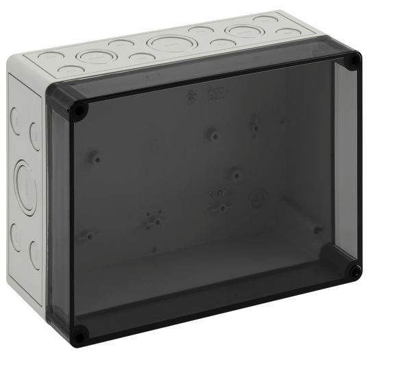 m = metrisch, o = ohne Vorprägung, tv = mit angespritzter Kabelverschraubung Leergehäuse, mit Schutzart IP66, Polycarbonat, glasfaserverstärkt, zertifiziert durch UL (UL 50 & CSA 22.2 No. 94.1-07, UL 50E & CSA C22.2 No. 94.2-07), DLG (Ammoniakbeständigkeit), DNV (Klasse: Schiffe & Offshore-Anlagen), Ui=690V AC, Ui=1000V DC, innenliegende Befestigungsstellen, für Installationen im industriellen Umfeld und geschütztem Außenbereich, Kasten: Polycarbonat, glasfaserverstärkt, grau, Deckel: Polycarbonat, transparent, Ausschlagmembranen, M20/M25/M32/M40, (32 seitlich)