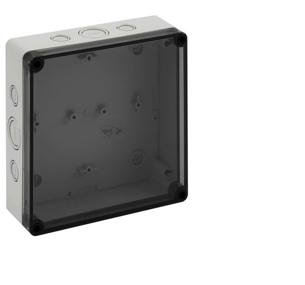 m = metrisch, o = ohne Vorprägung Leergehäuse, mit Schutzart IP66, Polystyrol, Ui=690V AC, Ui=1000V DC, innenliegende Befestigungsstellen, für Standardinstallationen im Innenbereich, Kasten: Polystyrol, grau, Deckel: Polycarbonat, transparent, Ausschlagmembranen, M16/M20/M25/M32, (12 seitlich)