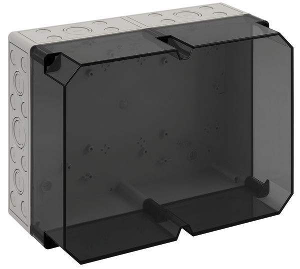 m = metrisch, o = ohne Vorprägung Leergehäuse, mit Schutzart IP66, Polystyrol, Ui=690V AC, Ui=1000V DC, innenliegende Befestigungsstellen, für Standardinstallationen im Innenbereich, Kasten: Polystyrol, grau, Deckel: Polycarbonat, transparent, Ausschlagmembranen, M20/M25/M32/M40, (42 seitlich)