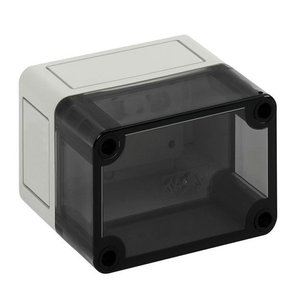 m = metrisch, o = ohne Vorprägung Leergehäuse, mit Schutzart IP66, Polystyrol, Ui=690V AC, Ui=1000V DC, innenliegende Befestigungsstellen, für Standardinstallationen im Innenbereich, Kasten: Polystyrol, grau, Deckel: Polycarbonat, transparent, glatte Seitenwände