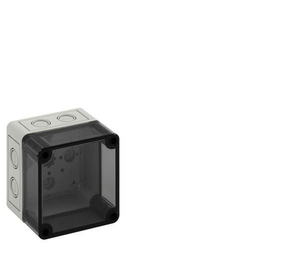 m = metrisch, o = ohne Vorprägung Leergehäuse, mit Schutzart IP66, Polystyrol, Ui=690V AC, Ui=1000V DC, innenliegende Befestigungsstellen, für Standardinstallationen im Innenbereich, Kasten: Polystyrol, grau, Deckel: Polycarbonat, transparent, Ausschlagmembranen, M16/M20, (7 seitlich)