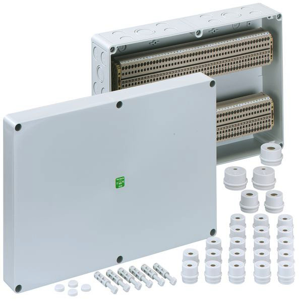 Reihenklemmengehäuse, mit Schutzart IP54/IP66, Nennquerschnitt 4mm², Ui=400V AC, Polystyrol, innenliegende Befestigungsstellen, für Standardinstallationen im Innenbereich, bestückt mit 100 schraubenlosen Klemmen 4mm² (Typ Weidmüller ZDU 4)