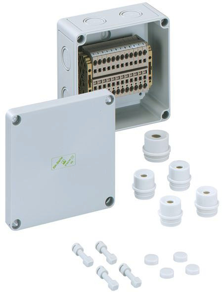 Reihenklemmengehäuse aus Polystyrol, Schutzuart IP 66, serienmäßig plombierbar, mit schraubenlosen Klemmen