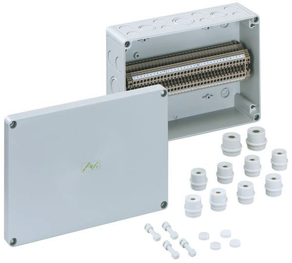 Reihenklemmengehäuse, mit Schutzart IP54/IP66, Nennquerschnitt 4mm², Ui=400V AC, Polystyrol, innenliegende Befestigungsstellen, für Standardinstallationen im Innenbereich, bestückt mit 34 Schraubklemmen 4mm² (Typ Weidmüller WDU 4)