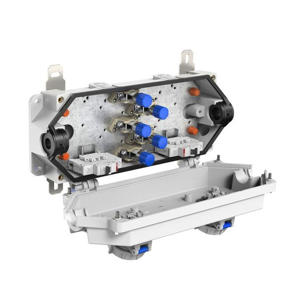Abzweigkasten, mit Schutzart IP66/IP67, Ui=400 V AC, M25, (5 seitlich), außenliegende Befestigungsstellen, für Installationen im industriellen Umfeld und Tunnelbereich, Druck-Sog-Dicht nach Gotthard-Richtlinie. Halogenfreies Gehäuse aus Spezialduroplast, Klemmen aus hochtemperaturbeständiger Spezialkeramik. Außenbefestigungslaschen und Deckelschrauben aus Edelstahl 1.4571, grau, Durchgang: 5-polige Klemme für ungeschnittene Leiter, Klemmbereich für ungeschnittene Leiter 2,5mm² bis 25mm², Klemmbereich für geschnittene Leiter 2,5mm² bis 16mm², Bemessungsstrom 63A. In Deckel montiert 2 Stück CEE-Steckdose 3-polig 16A, Absicherung durch 2 x Leitungsschutzschalter einpolig B10, vorverdrahtet, Dichtbereich Hauptkabel: 17-22mm (andere Dichtbereiche auf Anfrage)