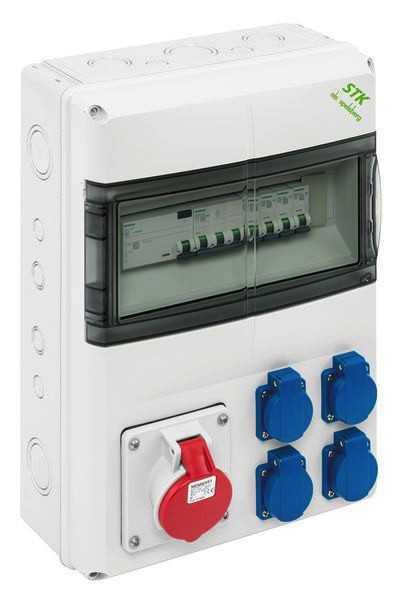 Steckdosenkombination, mit Schutzart IP44, anschlussfertig nach EN61439-3, mit zentraler Anschlussklemme 4-25mm², 5-polig, auch geeignet zum Durchschleifen der Zuleitung, werkzeuglos entnehmbare Normschienen zur einfachen Leitungsverlegung im Gehäuse, CEE-Steckdosen mit 20°Neigung, einfache Kombination mit STK-Zusatzgehäusen oder AK Air Verteilern mit Flanschöffnungen (AK-F), inkl. Flansche, verfügbare Teilungseinheiten: 14