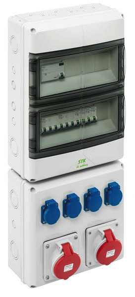 Steckdosenkombination, mit Schutzart IP44, anschlussfertig nach EN61439-3, mit zentraler Anschlussklemme 4-25mm², 5-polig, auch geeignet zum Durchschleifen der Zuleitung, werkzeuglos entnehmbare Normschienen zur einfachen Leitungsverlegung im Gehäuse, CEE-Steckdosen mit 20°Neigung, einfache Kombination mit STK-Zusatzgehäusen oder AK Air Verteilern mit Flanschöffnungen (AK-F), inkl. Flansche, verfügbare Teilungseinheiten: 28