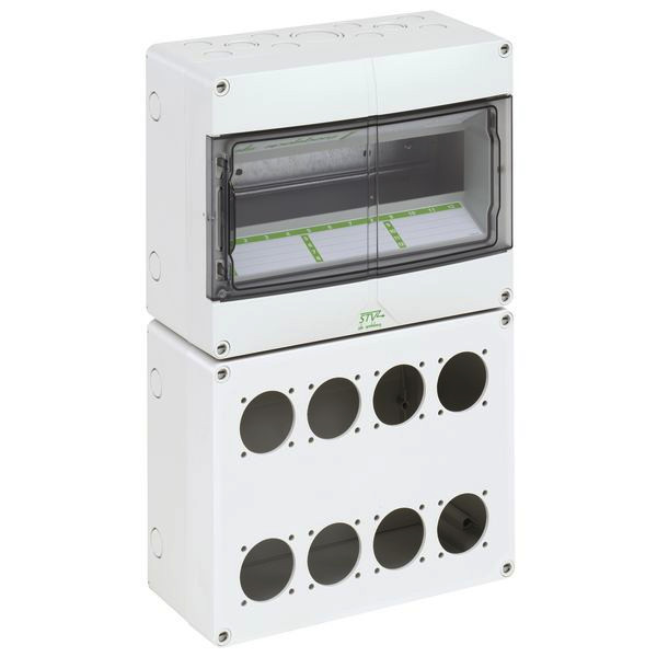 Steckdosenleergehäuse, mit Schutzart IP44, geeignet zum kundenseitigen Einbau von Reiheneinbaugeräten und Anbausteckdosen, inkl. PE-/N-Klemme sowie Adaptern und Schrauben zur Montage der Steckdosen, hohe mechanische Belastbarkeit, temperaturunempfindlich, kombinierbar, halogenfrei