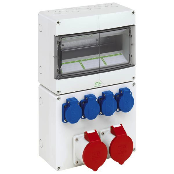 Steckdosenkombination, mit Schutzart IP44, geeignet zum kundenseitigen Einbau von Reiheneinbaugeräten, mit eingebauten, auf PE-/N-Klemme vorverdrahteten Steckdosen, hohe mechanische Belastbarkeit, temperaturunempfindlich, kombinierbar, halogenfrei
