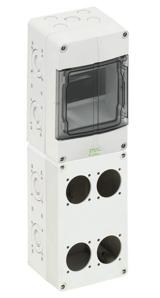 Steckdosenkombination, mit Schutzart IP44, geeignet zum kundenseitigen Einbau von Reiheneinbaugeräten und Anbausteckdosen, inkl. PE-/N-Klemme sowie Adaptern und Schrauben zur Montage der Steckdosen, hohe mechanische Belastbarkeit, temperaturunempfindlich, kombinierbar, halogenfrei