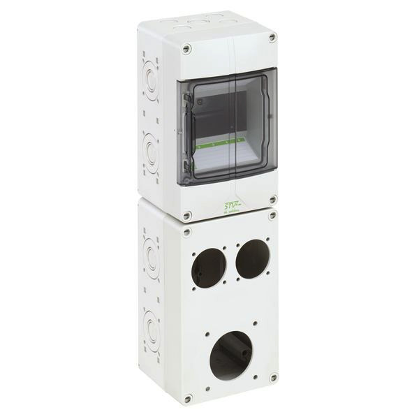 Steckdosenkombination, mit Schutzart IP44, geeignet zum kundenseitigen Einbau von Reiheneinbaugeräten und Anbausteckdosen, inkl. PE-/N-Klemme sowie Adaptern und Schrauben zur Montage der Steckdosen, hohe mechanische Belastbarkeit, temperaturunempfindlich, kombinierbar, halogenfrei