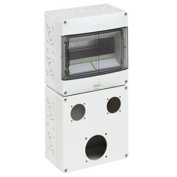 Steckdosenleergehäuse, mit Schutzart IP44, geeignet zum kundenseitigen Einbau von Reiheneinbaugeräten und Anbausteckdosen, inkl. PE-/N-Klemme sowie Adaptern und Schrauben zur Montage der Steckdosen, hohe mechanische Belastbarkeit, temperaturunempfindlich, kombinierbar, halogenfrei