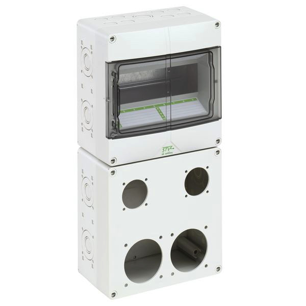 Steckdosenleergehäuse, mit Schutzart IP44, geeignet zum kundenseitigen Einbau von Reiheneinbaugeräten und Anbausteckdosen, inkl. PE-/N-Klemme sowie Adaptern und Schrauben zur Montage der Steckdosen, hohe mechanische Belastbarkeit, temperaturunempfindlich, kombinierbar, halogenfrei