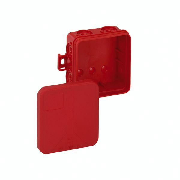 Abzweigdose, mit Schutzart IP55, Nennquerschnitt 2,5mm², Ui=400 V AC, zertifiziert durch VDE (DIN EN 60670-1/-22 (VDE 0606-1/-22)), selbstdichtende Einführungsmembranen, Dichtbereich 8,2-12,5mm, (3 rückseitig, 7 seitlich), außenliegende Befestigungsstellen, für Standardinstallationen im Innenbereich, rot, ohne Klemmen, zur Kennzeichnung von Stromkreisen der Sicherheitsbeleuchtung