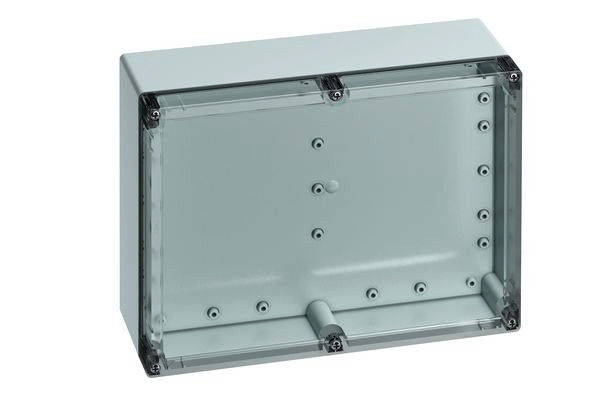 Leergehäuse, mit Schutzart IP66/IP67, Polycarbonat, zertifiziert durch UL (UL 50 & CSA 22.2 No. 94.1-07, UL 50E & CSA C22.2 No. 94.2-07), DLG (Ammoniakbeständigkeit), Ui=690V AC, Ui=1000V DC, innenliegende Befestigungsstellen, für Installationen im industriellen Umfeld und geschütztem Außenbereich, mit Schnellverschluss, Kasten: Polycarbonat, grau, Deckel: Polycarbonat, transparent, glatte Seitenwände