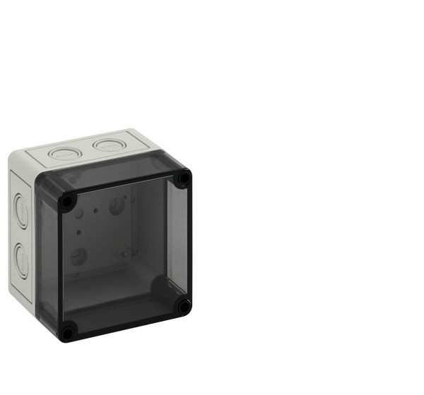 m = metrisch, o = ohne Vorprägung, tv = mit angespritzter Kabelverschraubung Leergehäuse, mit Schutzart IP66, Polycarbonat, glasfaserverstärkt, zertifiziert durch UL (UL 508 & CSA C22.2 No. 14-13, UL 50 & CSA 22.2 No. 94.1-7 & UL 50E & CSA C22.2 No. 94.2-7), DLG (Ammoniakbeständigkeit), DNV (Klasse: Schiffe & Offshore-Anlagen), Ui=690V AC, Ui=1000V DC, innenliegende Befestigungsstellen, für Installationen im industriellen Umfeld und geschütztem Außenbereich, Kasten: Polycarbonat, glasfaserverstärkt, grau, Deckel: Polycarbonat, transparent, Ausschlagmembranen, M20/M25, (7 seitlich)