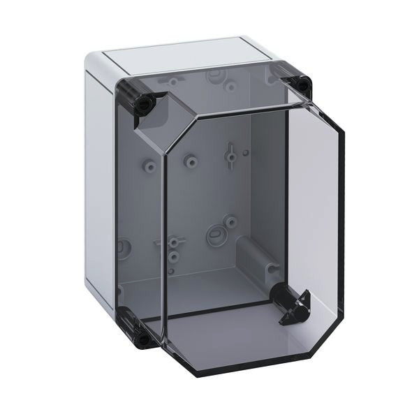 Leergehäuse, mit Schutzart IP66, Polystyrol, Ui=690V AC, Ui=1000V DC, innenliegende Befestigungsstellen, für Standardinstallationen im Innenbereich, Kasten: Polystyrol, grau, Deckel: Polycarbonat, transparent, glatte Seitenwände