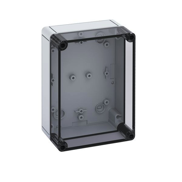 Leergehäuse, mit Schutzart IP66, Polystyrol, Ui=690V AC, Ui=1000V DC, innenliegende Befestigungsstellen, für Standardinstallationen im Innenbereich, Kasten: Polystyrol, grau, Deckel: Polycarbonat, transparent, glatte Seitenwände
