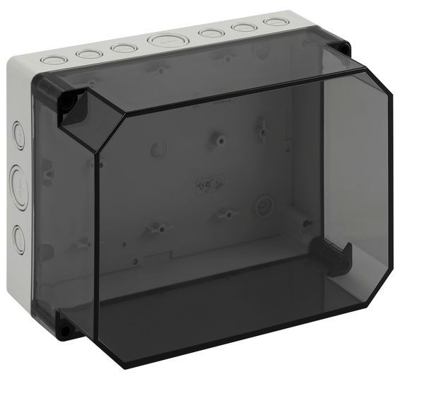 m = metrisch, o = ohne Vorprägung Leergehäuse, mit Schutzart IP66, Polystyrol, Ui=690V AC, Ui=1000V DC, innenliegende Befestigungsstellen, für Standardinstallationen im Innenbereich, Kasten: Polystyrol, grau, Deckel: Polycarbonat, transparent, Ausschlagmembranen, M16/M20/M25/M32, (20 seitlich)