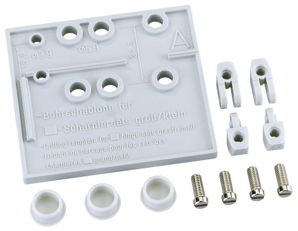 Außenscharnier-Set zum Umrüsten des Gehäusedeckels zur Klapptür. Inkl. 2 Scharniere, Befestigungsschrauben, Abdeckstopfen und Bohrschablone, Aussenscharnierset klein, TK PS/PC 77 bis TK PS/PC 1809