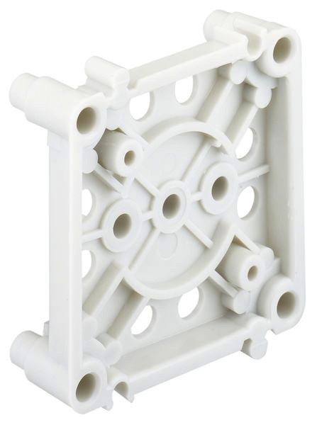 Basiselement zur Abstützung von IBT Dosen und Kästen bei Gegenschalung (in Verbindung mit Stützholmen), kombinierbar durch Rastverbindung (Ein späteres Verputzen der Blindsockel-Befestigungsstellen ist evtl. erforderlich, die Schalungsstandzeiten zum Aushärten des Betons sind vom Bauunternehmer einzuhalten)