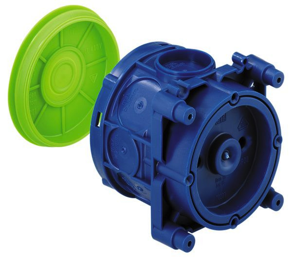 auch für Magnetbefestigung Geräte-Verbindungsdose, 4 Schraubdome mit Schraubabstand 60mm, kombinierbar im Normabstand 71mm, vollisolierter Leitungsübergang, geeignet für alle Schalungsarten und Gegenschalung, mit Schutzart IP30, Bemessungsisolationsspannung: 400V AC, zertifiziert durch VDE (DIN EN 60670-1/-22 (VDE 0606-1/-22)), halogenfrei, 2-teilig, mit vergrößertem Anschlussraum,, Magnet- oder Nagelbefestigung, Membran zur Lochung, Dichtbereich M16-M25, stützholmfähig